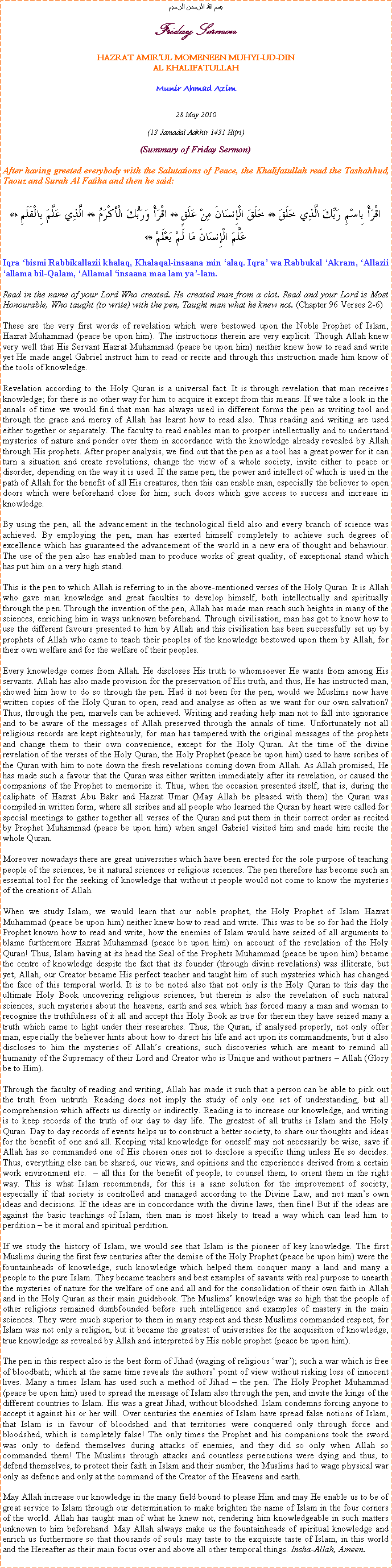 Revelation according to the Holy Quran is a universal fact. It is through revelation that man receives knowledge; for there is no other way for him to acquire it except from this means. If we take a look in the annals of time we would find that man has always used in different forms the pen as writing tool and through the grace and mercy of Allah has learnt how to read also. Thus reading and writing are used either together or separately. The faculty to read enables man to prosper intellectually and to understand mysteries of nature and ponder over them in accordance with the knowledge already revealed by Allah through His prophets. After proper analysis, we find out that the pen as a tool has a great power for it can turn a situation and create revolutions, change the view of a whole society, invite either to peace or disorder, depending on the way it is used. If the same pen, the power and intellect of which is used in the path of Allah for the benefit of all His creatures, then this can enable man, especially the believer to open doors which were beforehand close for him; such doors which give access to success and increase in knowledge.