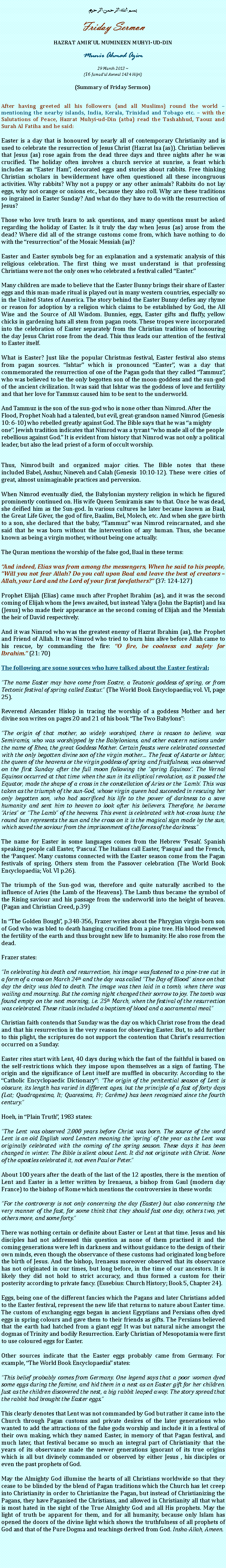 Those who love truth learn to ask questions, and many questions must be asked regarding the holiday of Easter. Is it truly the day when Jesus (as) arose from the dead? Where did all of the strange customs come from, which have nothing to do with the “resurrection” of the Mosaic Messiah (as)?