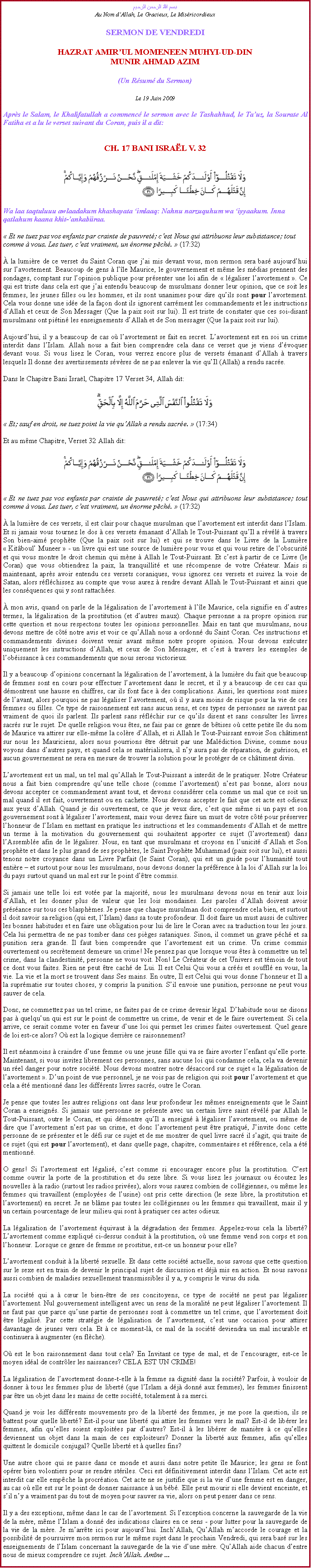 À la lumière de ce verset du Saint Coran que j’ai mis devant vous, mon sermon sera basé aujourd’hui sur l’avortement. Beaucoup de gens à l’île Maurice, le gouvernement et même les médias prennent des sondages, comptant sur l’opinion publique pour présenter une loi afin de « légaliser l’avortement ». Ce qui est triste dans cela est que j’ai entendu beaucoup de musulmans donner leur opinion, que ce soit les femmes, les jeunes filles ou les hommes, et ils sont unanimes pour dire qu’ils sont pour l’avortement. Cela vous donne une idée de la façon dont ils ignorent carrément les commandements et les instructions d’Allah et ceux de Son Messager (Que la paix soit sur lui). Il est triste de constater que ces soi-disant musulmans ont piétiné les enseignements d’Allah et de Son messager (Que la paix soit sur lui).